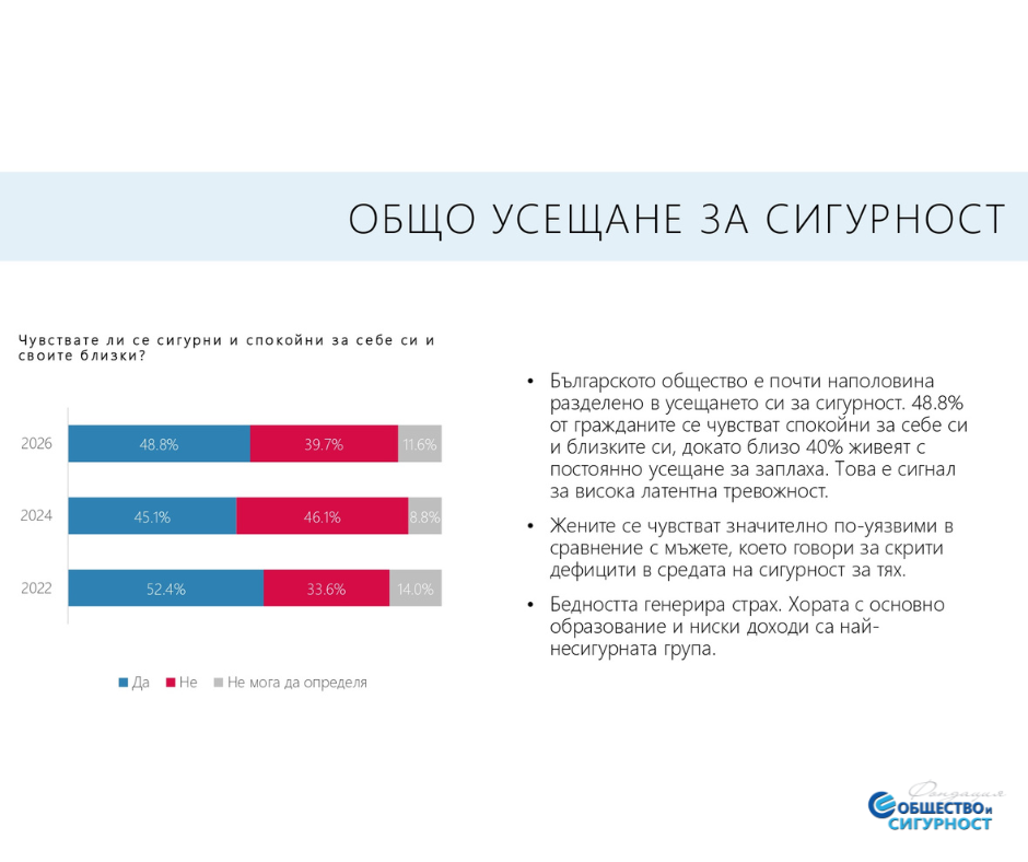 Изследването показва и друг тревожен факт – българското общество е почти наполовина разделено в усещането си за сигурност.