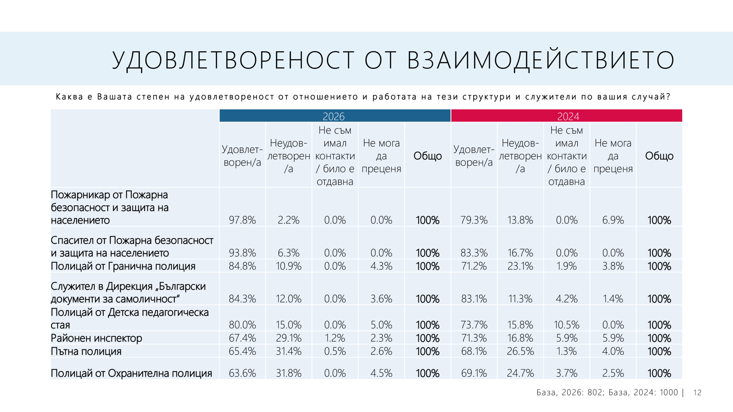 - Със силно доверие се ползва Главна дирекция „Пожарна безопасност и защита на населението“ (над 90% удовлетвореност).