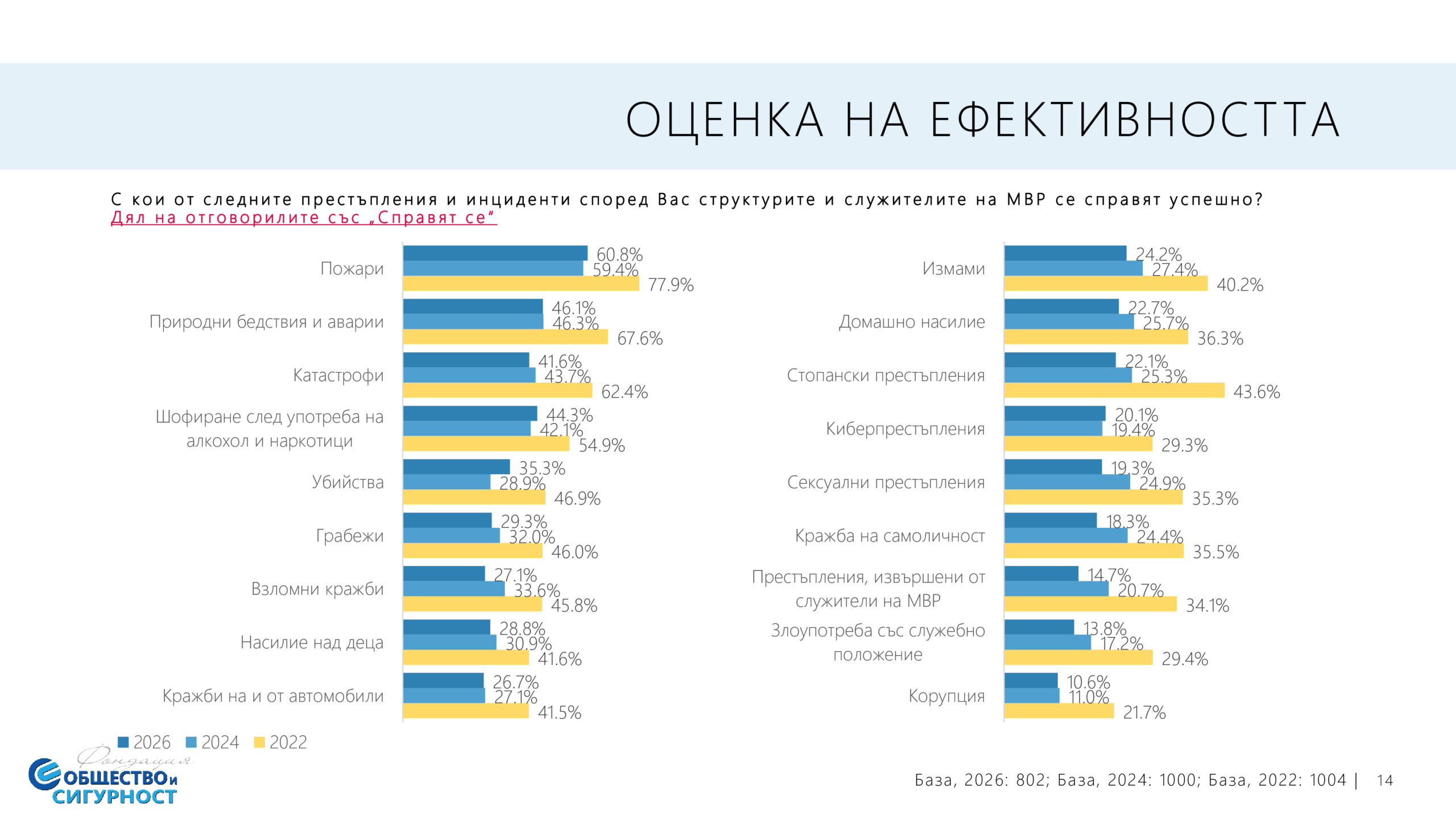 Най-същественият резултат от проучването е промяната в дефиницията за сигурност. Докато в предходни години водещо е било очакването за бърза реакция на институциите, през 2026 г. сигурността се свързва основно с адекватно наказване на престъпниците (52.2%), равенство пред закона (46.9%) и разкриване на престъпления (46.9%).
