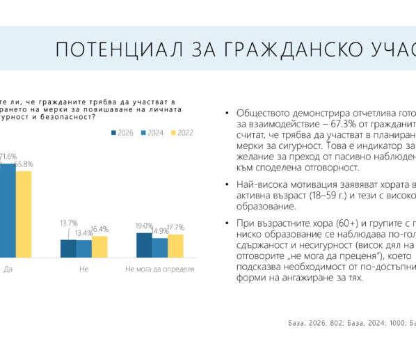 СИГУРНОСТТА В БЪЛГАРИЯ ПРЕЗ 2026: ОБЩЕСТВО МЕЖДУ НОРМАЛИЗИРАНА НЕСИГУРНОСТ, ЕРОЗИЯ НА ДОВЕРИЕ И НАРАСТВАЩО ТЪРСЕНЕ НА СПРАВЕДЛИВОСТ София, 31 март 2026 г. Национално представително проучване сред 802 пълнолетни граждани на…
